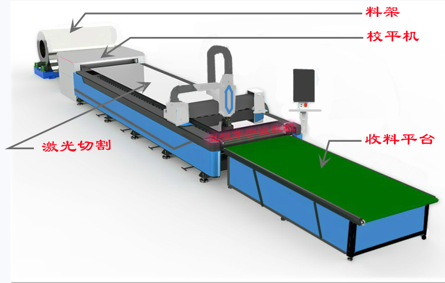 卷料備展開后,經(jīng)過了整平這一工序,材料內(nèi)應(yīng)力便得到了大部分的消除,在通過系統(tǒng)控制的激光切割頭在激光切割平臺(tái)上進(jìn)行的三維運(yùn)動(dòng)切割,實(shí)現(xiàn)對金屬帶料的自動(dòng)落料。